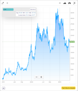 The value of the underlying equity, COIN, is way up over the last couple years, but is well below its December all-time high. Even with the uncertainty in US and global markets, there is still a lot of upside value at this price. Additionally, Kenneth Worthington at JP Morgan has a price prediction of $276 by the end of 2025, further indicating growth will likely occur.